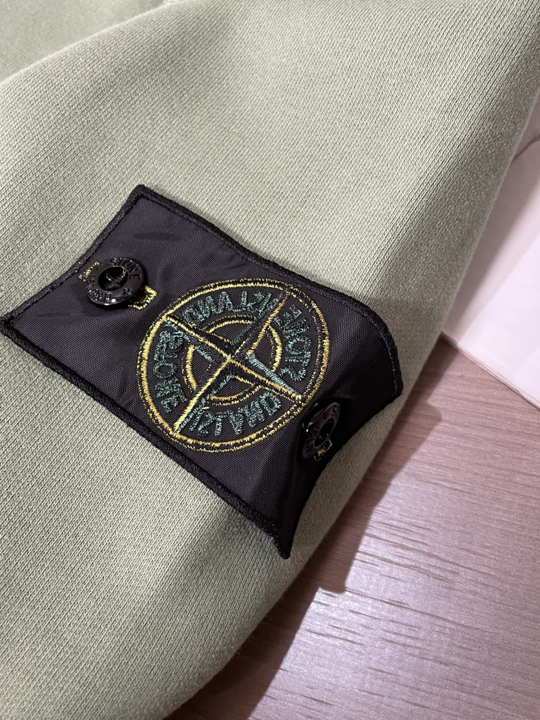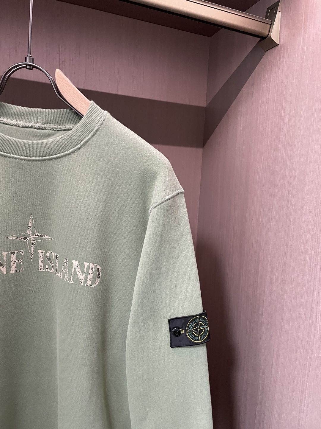 ストーンアイランドの定番デザインをベースに仕上げたクルーネックスウェットです。柔らかな淡いグリーンカラーが特徴で、落ち着きのある色味がコーディネートに自然に馴染みます。フロントにはブランドロゴをシンプルに配置し、背面には象徴的な羅盤モチーフをヴィンテージ調でプリント。