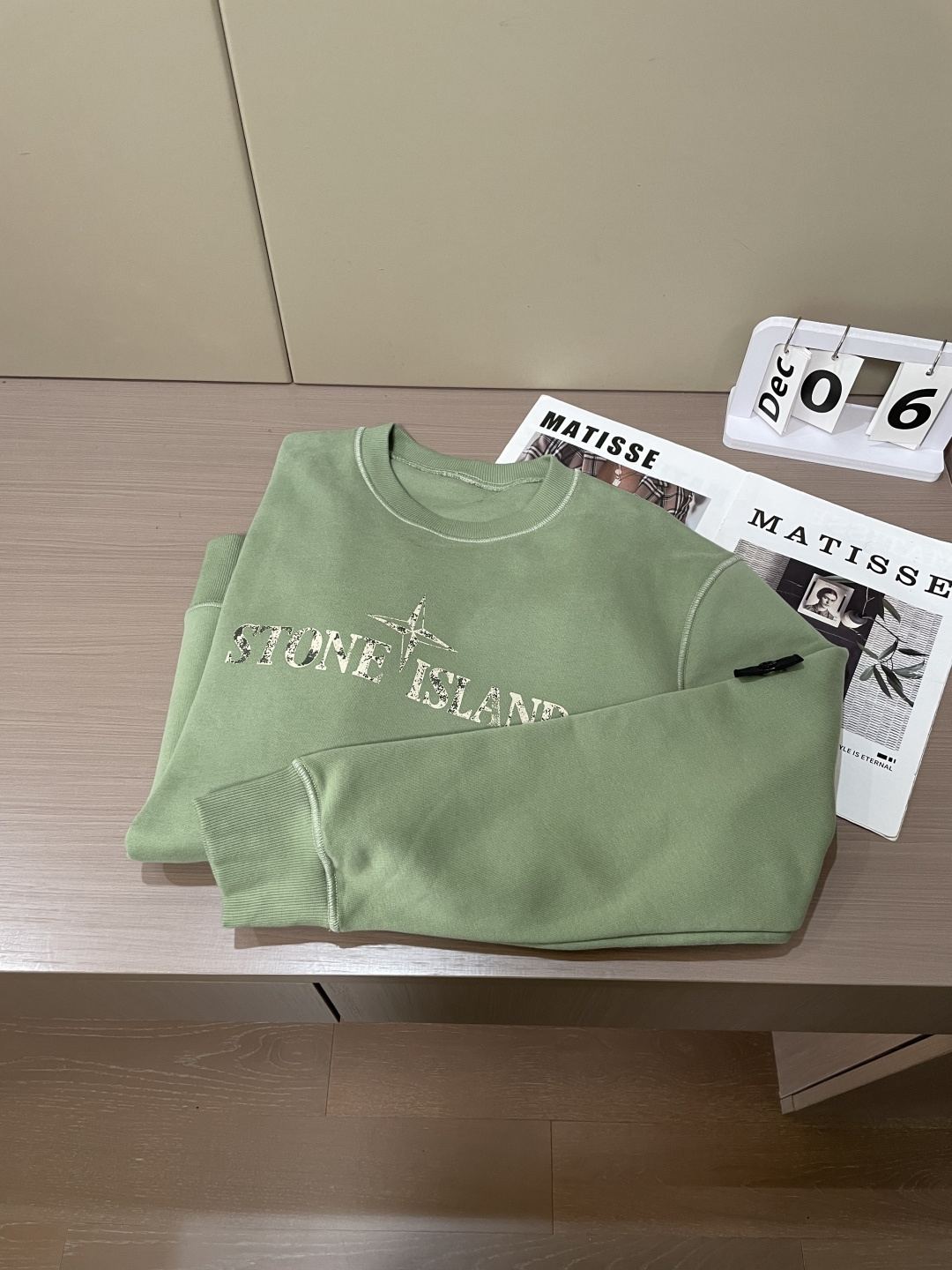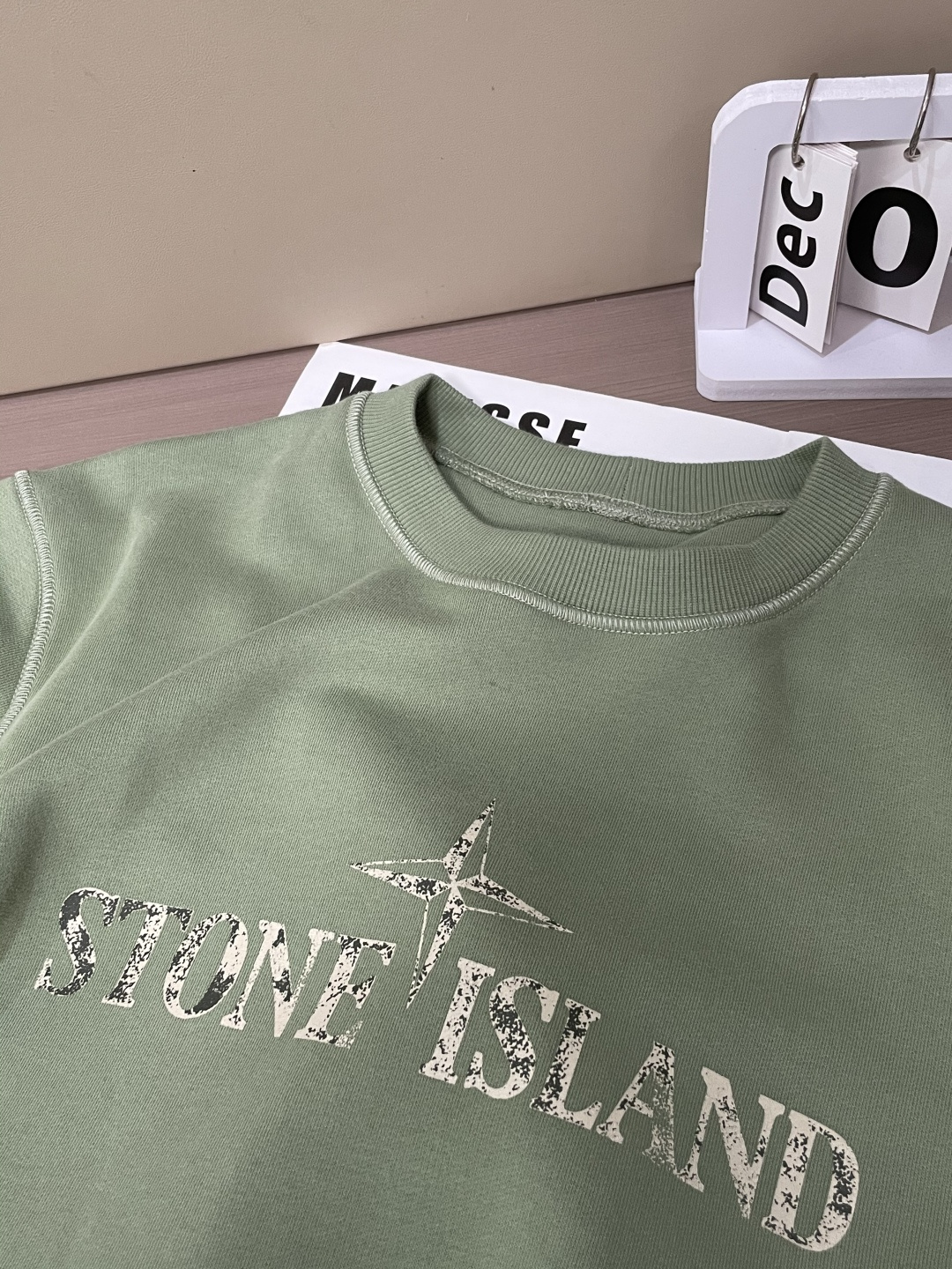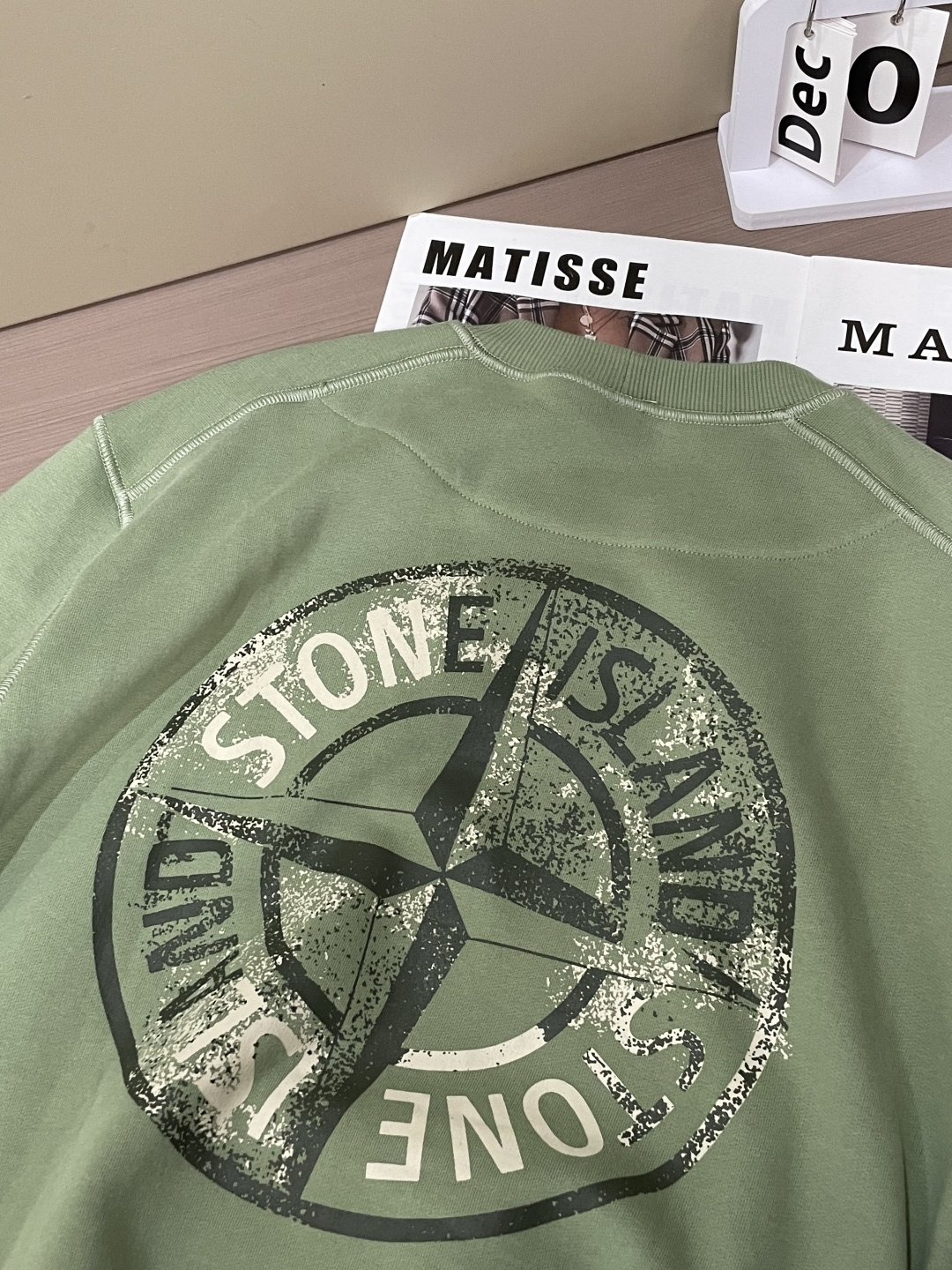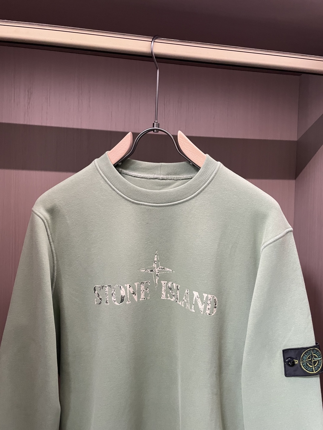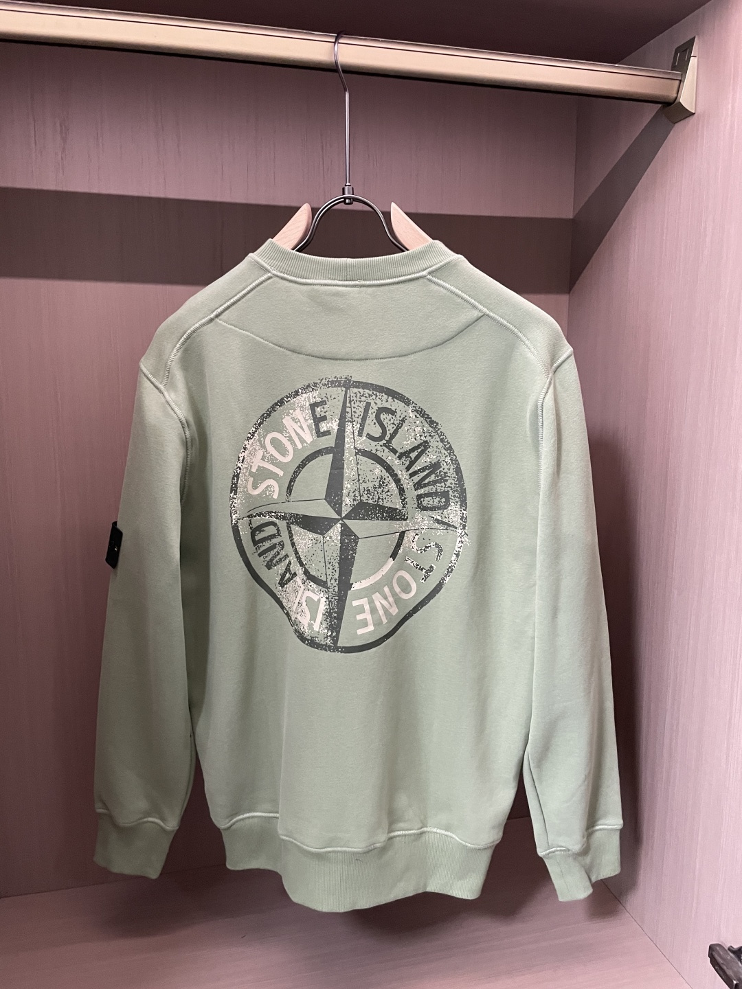 ストーンアイランドの定番デザインをベースに仕上げたクルーネックスウェットです。柔らかな淡いグリーンカラーが特徴で、落ち着きのある色味がコーディネートに自然に馴染みます。フロントにはブランドロゴをシンプルに配置し、背面には象徴的な羅盤モチーフをヴィンテージ調でプリント。