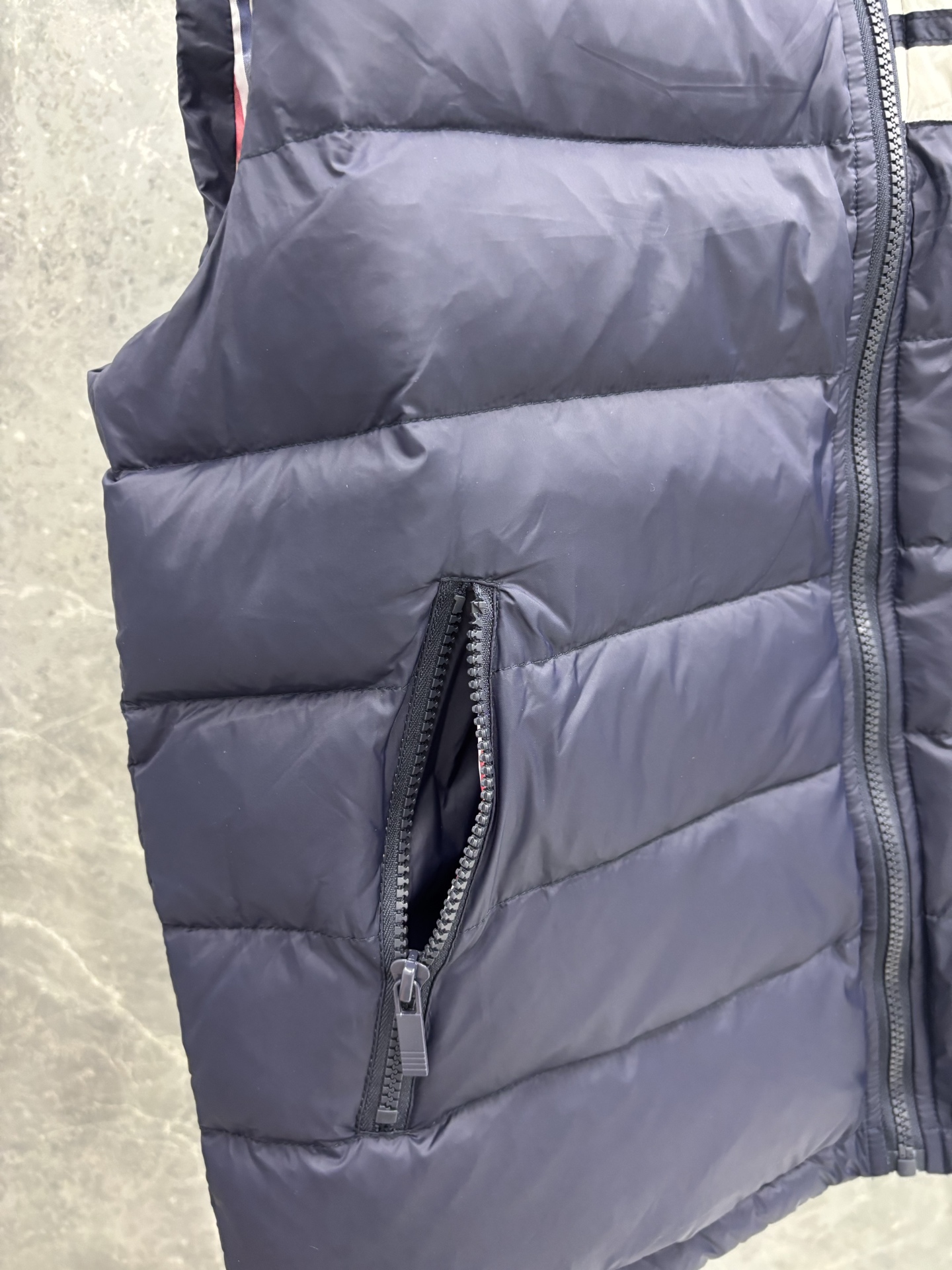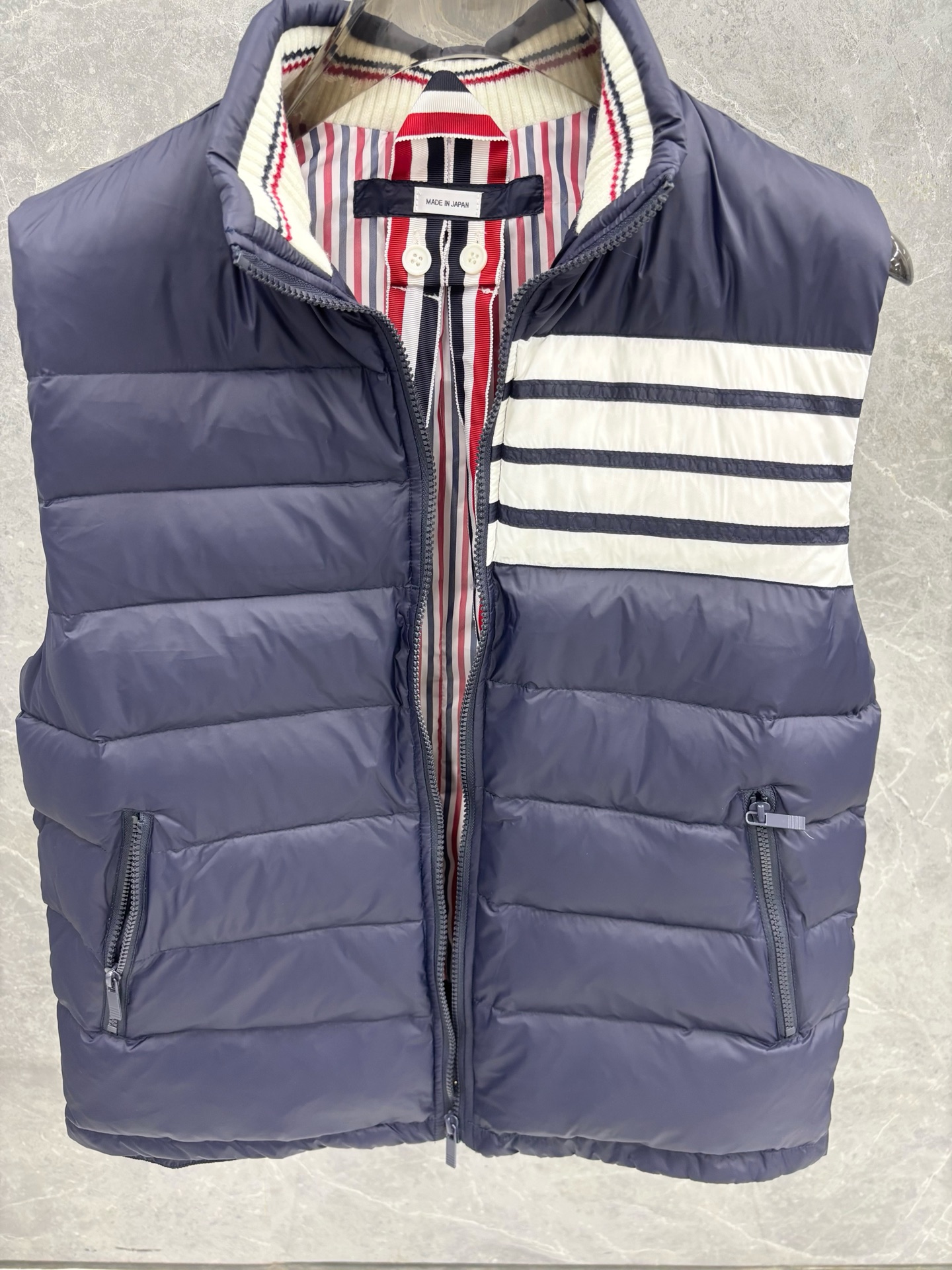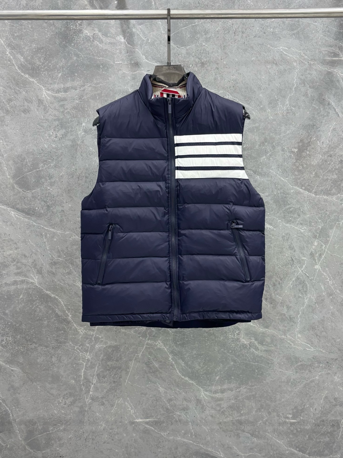 トムブラウン n級コピー 4BAR ダウンベスト 落ち着いたネイビーの上質感モデル
