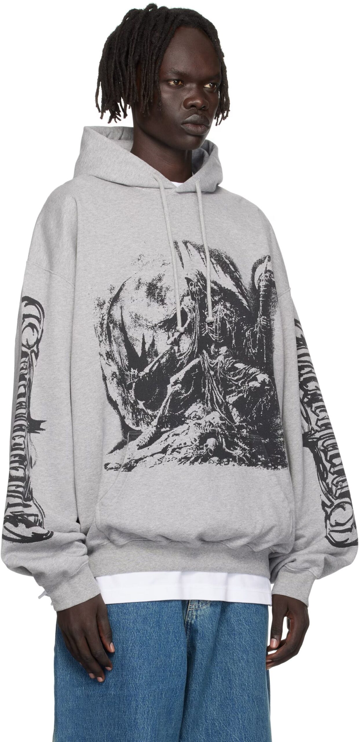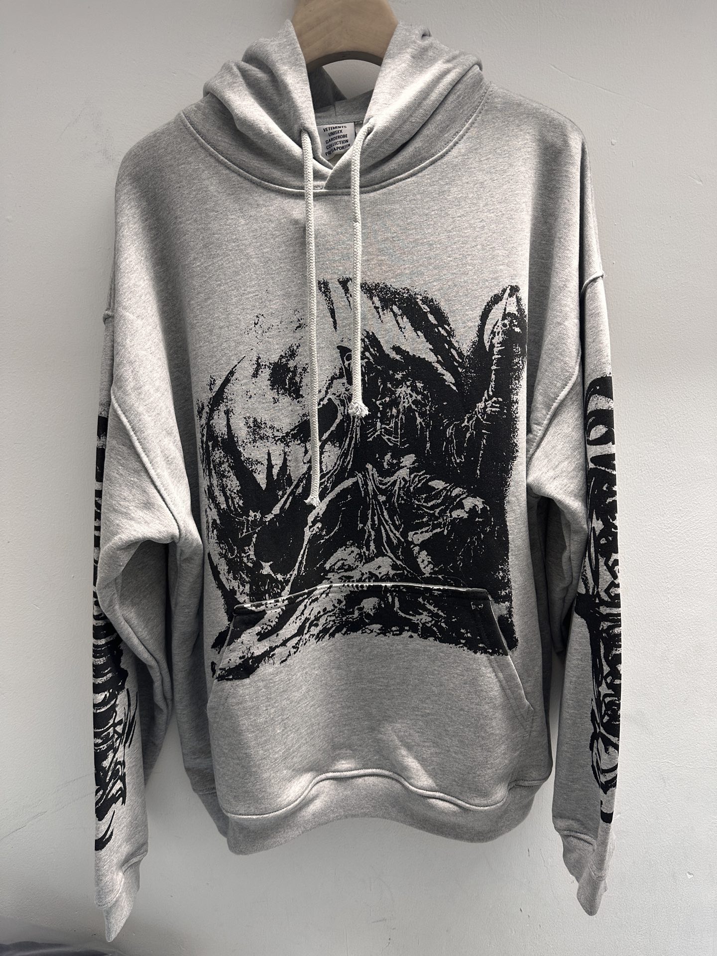 淡いグレーカラーに強いコントラストのアートプリントを組み合わせた、存在感抜群の一着。ヴェトモン(Vetements)らしい実験的なデザインが特徴で、シンプルなボトムスと合わせるだけでも完成度の高いスタイルが完成します。芸能人偽物仕様として、プリントの擦れ感や濃淡表現まで丁寧に再現。生地は程よい厚みがあり、着用時のシルエットも美しく保たれます。人と被りにくいデザインを求める方におすすめです。