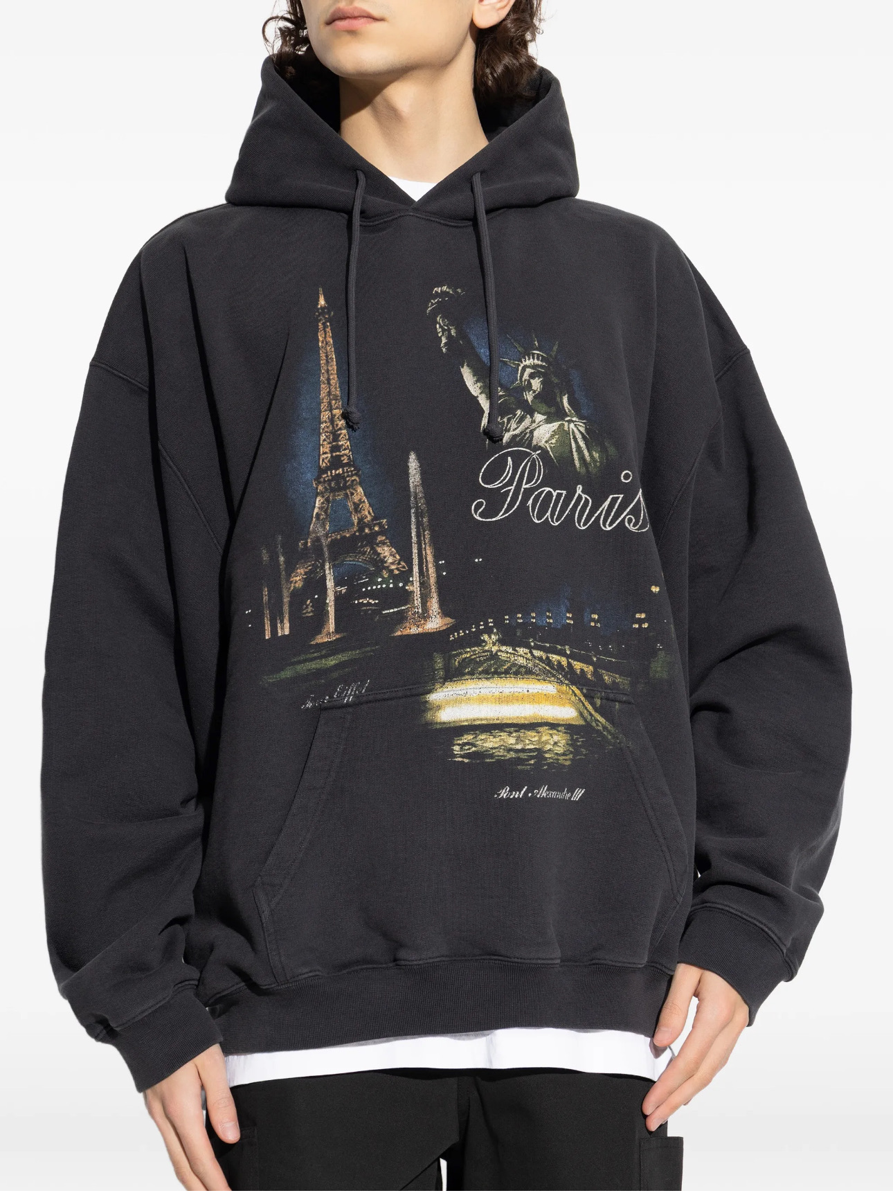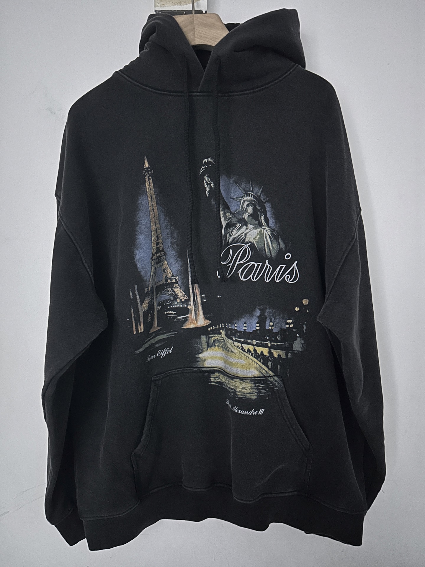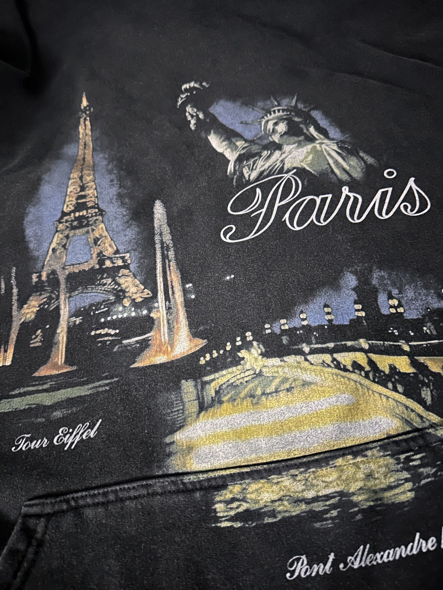 エッフェル塔や夜景の光を繊細に描き出し、ヴィジュアルとして強い存在感を放つヴェトモン(Vetements)の連帽パーカー。ブラックボディをベースにしながら、フロントのグラフィックが立体的に浮かび上がるような色彩設計となっており、一枚で主役になるデザインが魅力です。見分けがつかない高再現度を実現するため、プリントの階調や輝きの表現、配置バランスまで徹底的に調整。ゆったりとしたシルエットは男女問わず着こなしやすく、ストリートコーデからシンプルなデニム合わせまで幅広く対応します。2025年新作として注目されており、高級感とアート性を兼ね備えたモデルです。